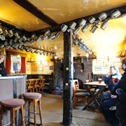 The main bar of the pub features a warming fire, a flagstone floor, a very unusual pewter-topped bar, and pewter tankards belonging to regular customers, past and present, hang from the ceiling, as used to be the tradition in many English pubs. The main bar dates from the 16th Century and the smaller bar was added in the 17th Century.